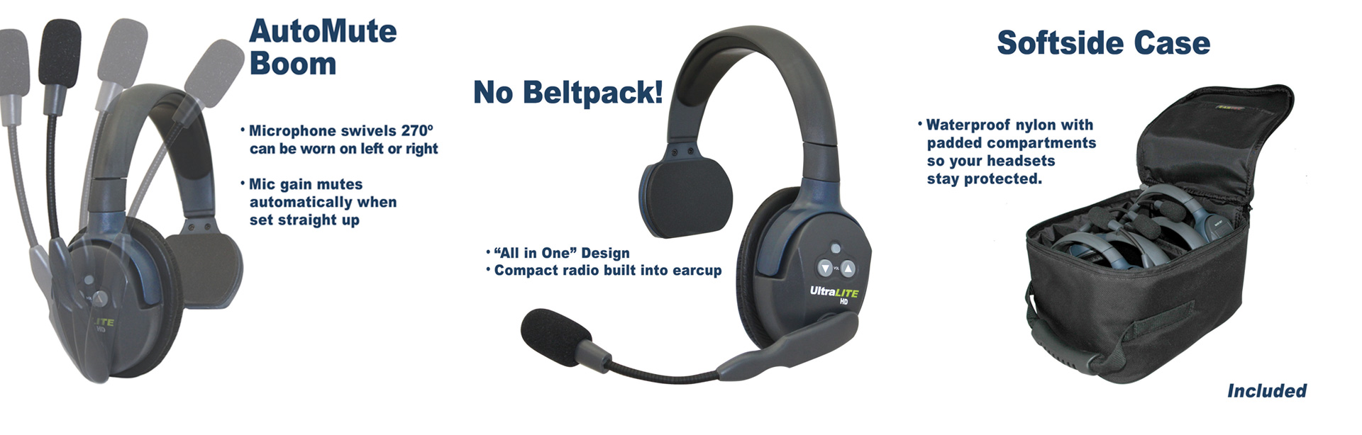 The Eartec UltraLITE are revolutionary headsets that eclipse all other full duplex systems for performance and convenience because the transceiver is built right inside the ear cup. This self-contained, “All in One” design eliminates wires and belt worn radios. And since UltraLITE do not require complicated base stations users can remain in constant full duplex voice contact even while on the move. The Standard UltraLITE intercoms provide instantaneous wireless communications for crews that need to communicate without pushing buttons. At the heart of these systems is a specialty base or “MAIN” headset that relays the digital signals generated by up to four “Remote” units. The resulting open line talking pattern allows up to 5 people to talk simultaneously so they can continue working with their hands. We only needed three so this was the perfect solution. UltraLITE Singles are the ones we selected as they are self-contained, full duplex wireless headsets with one speaker. They include a flexible gooseneck microphone boom assembly that swivels 270 degrees to be worn on either left or right. We loved that the single muff headsets mean we can keep one ear free and open to monitor the ambient environment while communicating with each other.
